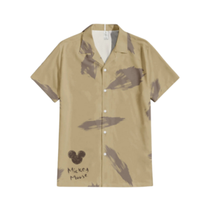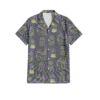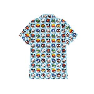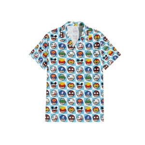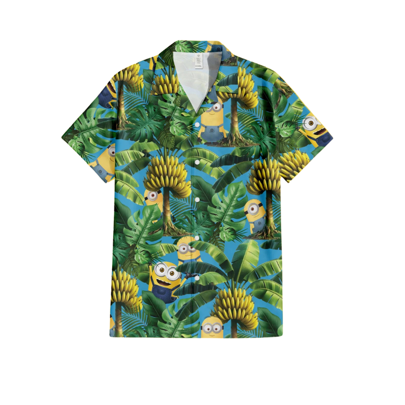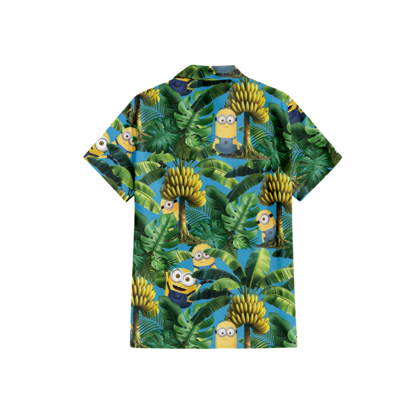 Regular fit Hawaiian shirt with Minions characters in banana trees style print. Cuban collar, full front coconut button closure with short sleeves.